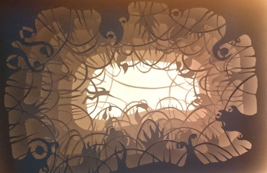 The process behind creating these dioramas is actually quite a simple, yet tedious experience. Each layer involved in a piece must be sketched out, cut with a scalpel, tidied up and then appropriately spaced away from the other layers. While no component is too hard to do on its own, creating a means of spacing the paper, providing strong backlighting and remaining delicate with the work combines to create a lengthy process.